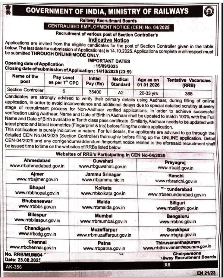 RRB Section Controller Vacancy 2025: रेलवे भर्ती बोर्ड (RRB) ने CEN 04/2025 के तहत RRB सेक्शन कंट्रोलर भर्ती 2025 की अधिसूचना जारी कर दी है। इस भर्ती के माध्यम से कुल 368 पदों पर नियुक्तियां होंगी। यदि आप भारतीय रेलवे में एक सुरक्षित और सम्मानजनक करियर बनाना चाहते हैं, तो यह मौका आपके लिए बेहतरीन हो सकता है।